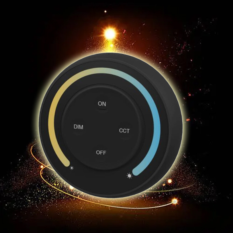 Round wall-mounted remote control for lamps, spotlights and dimmable white led controller (CCT). Communicates with 2.4 GHz wireless controllers.