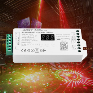 Funciona en DMX y permite variar la intensidad de la luz y los colores de una tira de led RGBW (en 4 canales).